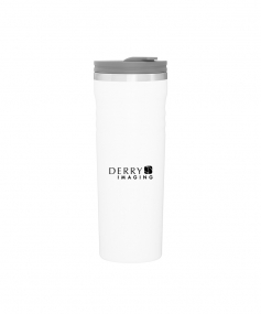 16.9 oz double wall tumbler with 18/8 stainless steel inner wall, stainless steel outer wall, vacuum insulation, push-on lid, swivel closure, stainless steel rim, and powder coated finish