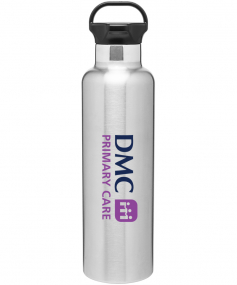 24 oz powder coated double wall 18/8 stainless steel thermal bottle with copper vacuum insulation, threaded gear-shaped insulated lid and carrying handle Complies with FDA, Prop 65. 11.25" H x 3" W