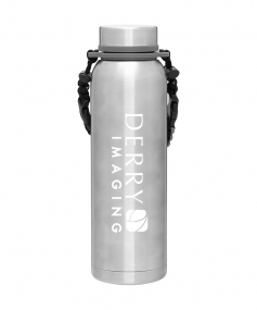 32 oz double wall 18/8 stainless steel thermal bottle with copper vacuum insulation, insulated stainless steel threaded lid, silicone ring, removable strap with buckles, removable clasps, and powder coated finish. Individual gift box. Hand wash recommended. Do not microwave. Complies with FDA, Prop 65. 11" H x 3.1875" W