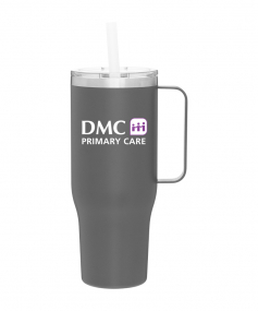 40 oz double wall 18/8 stainless steel thermal mug with copper vacuum insulation, stainless steel rim, dual-purpose push-on clear lid, matching sliding closure, flexible wide silicone straw, and powder coated finish. Individual gift box. Hand wash recommended. Do not microwave. Complies with FDA, Prop 65. 9.75" H x 4" W